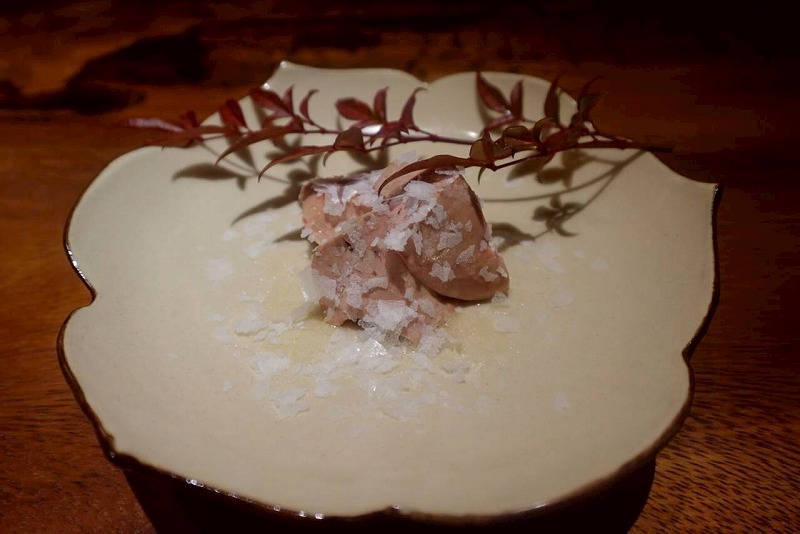 大阪・天満橋にある「焼鳥 燦然」のペアリングコースでは、肝のお造りに合わせて樽熟成した甲州を提供しています。