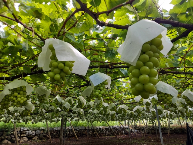 海外の産地では見かけない栽培法として、ブドウの笠かけがあります。成熟期のブドウが雨に当たらないよう、水に強い紙の笠を1房1房にかけるのです。
