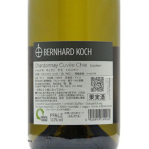 他の画像を見る 【「坂田さんの味」が大人気!】 シャルドネ キュヴェ チエ トロッケン 2023 ベルンハルト コッホ 白ワイン 定価 ¥ 3,850 のところ 価格 ¥ 3,212 税込 会員特別価格 ¥ 3,212 税込 カートに入れる お気に入りに登録する