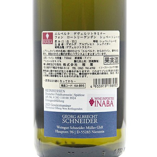 他の画像を見る 【余韻の『キレ』が一味違う!】 エルベルク ゲヴュルツトラミナー フォン ロートリーゲンデン シュペートレーゼ 2023 ゲオルグ アルブレヒト シュナイダー 白ワイン 定価 ¥ 3,080 のところ 価格 ¥ 2,574 税込 会員特別価格 ¥ 2,574 税込 カートに入れる お気に入りに登録する