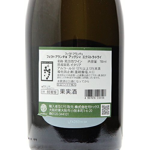 他の画像を見る 【カジュアルな飲み会の乾杯に!】 フェウド アランチョ アックシィ エクストラ ドライ NV スパークリング 定価 ¥ 1,650 のところ 価格 ¥ 1,320 税込 会員特別価格 ¥ 1,320 税込 カートに入れる お気に入りに登録する
