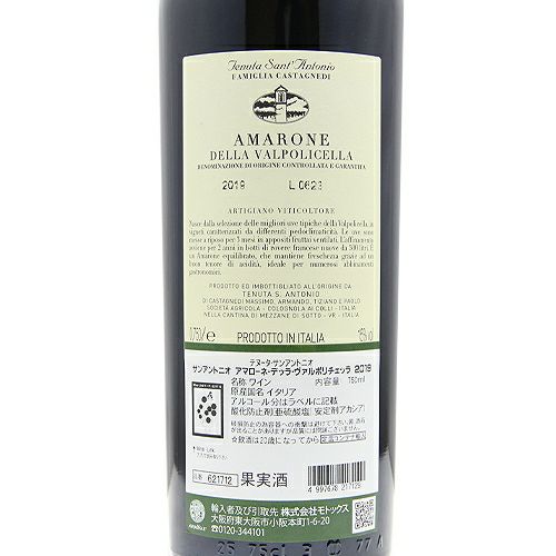 他の画像を見る 【アマローネでも酸を大事に】 アマローネ デッラ ヴァルポリチェッラ 2019 テヌータ サン アントニオ 赤ワイン 定価 ¥ 8,470 のところ 価格 ¥ 6,710 税込 会員特別価格 ¥ 6,710 税込 カートに入れる お気に入りに登録する