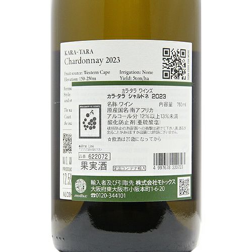 他の画像を見る 【この価格帯にはあまりない高級感】 カラ タラ シャルドネ 2023 カラ タラ (スターク・コンデ) 白ワイン 定価 ¥ 3,520 のところ 価格 ¥ 2,805 税込 会員特別価格 ¥ 2,805 税込 カートに入れる お気に入りに登録する