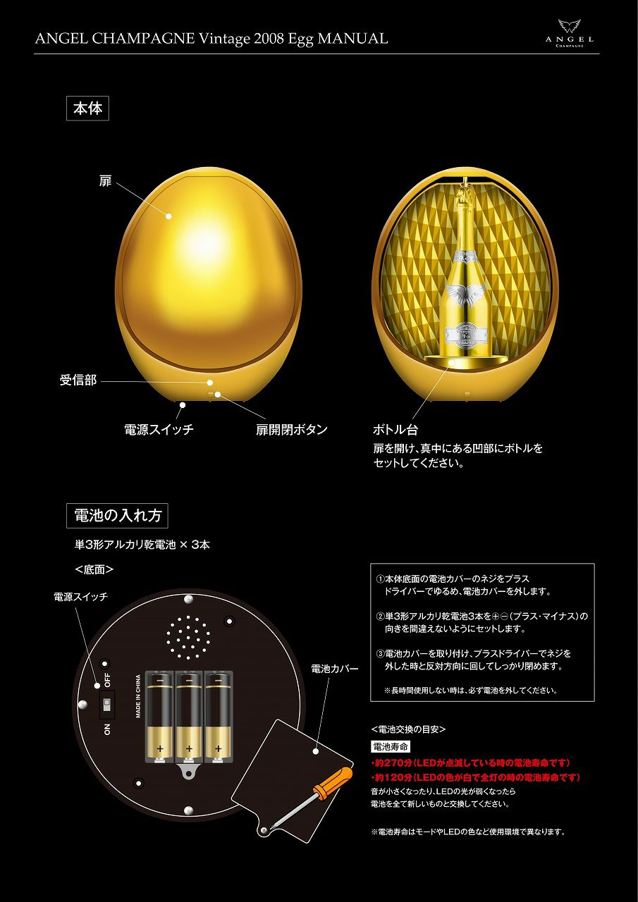 他の画像を見る 【ラグジュアリーシャンパン!新色グリーン】 エンジェル シャンパーニュ ヴィンテージ グリーン エッグ 2008 スパークリング 定価 ¥ 198,000 のところ 価格 ¥ 198,000 税込 会員特別価格 ¥ 198,000 税込 詳細を見る お気に入りに登録する