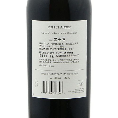晩熟、熟すまでに非常に長い時間がかかる品種で、熟度が低いとピーマンなどの青臭い香りが出やすく、栽培が難しいと言われます。ボルドーではレベルの高いワインはつくりづらいでしょう。地中海性の安定した気候で、晴天が年間で300日もあるチリだからこそ、この「パープル・エンジェル」のようなプレミアムワインができるのです。