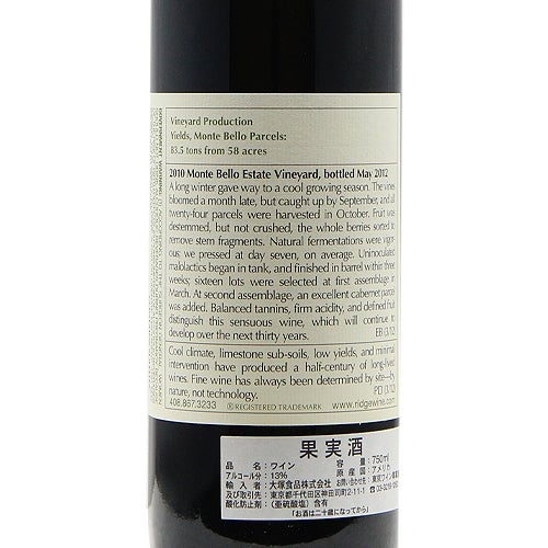 他の画像を見る 【パーカーポイント96点】 リッジ ヴィンヤーズ モンテベロ 2010 赤ワイン 定価 ¥ 0 のところ 価格 ¥ 27,940 税込 会員特別価格 ¥ 27,940 税込 カートに入れる お気に入りに登録する