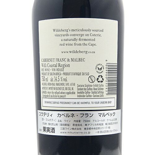 他の画像を見る 【できる限り自然のままにテロワールを表現】 ワイルドバーグ コウテリィ カベルネ フラン マルベック 2021 赤ワイン 定価 ¥ 2,838 のところ 価格 ¥ 2,442 税込 会員特別価格 ¥ 2,442 税込 在庫切れ 詳細を見る お気に入りに登録する