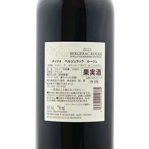 他の画像を見る 【日本限定の特別なキュヴェ】 メッツオ ベルジュラック ルージュ 2021 or 2022 シャトー デ ゼサール 赤ワイン 定価 ¥ 1,980 のところ 価格 ¥ 1,584 税込 会員特別価格 ¥ 1,584 税込 安くて美味い コスパワイン コスパ最強 お買い得 旨安ワイン 安旨 コストパフォーマンスが高い デイリーワイン 家飲みワイン 宅飲みワイン カートに入れる お気に入りに登録する