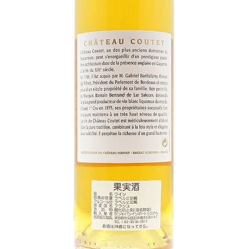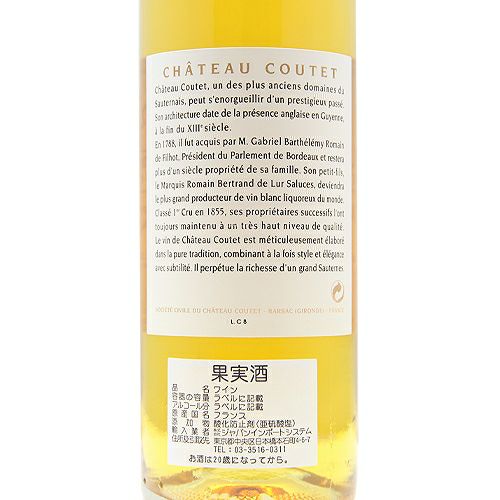 他の画像を見る 【パーカーポイント92点】 シャトー クーテ ハーフ 1998 白ワイン 定価 ¥ 0 のところ 価格 ¥ 4,752 税込 会員特別価格 ¥ 4,752 税込 在庫切れ 詳細を見る お気に入りに登録する