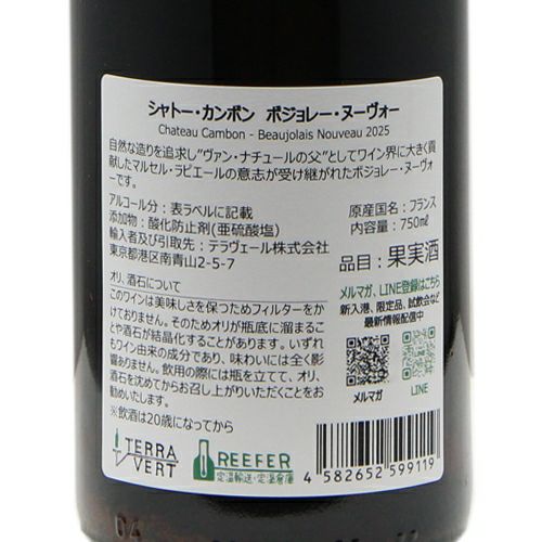 他の画像を見る 【畑で出会った妻が受け継ぐ!】 ボジョレー ヌーヴォー 2025 シャトー カンボン 【11月20日解禁】 赤ワイン 定価 ¥ 0 のところ 価格 ¥ 3,872 税込 会員特別価格 ¥ 3,872 税込 在庫切れ 新酒 ボージョレ ヌーボー ボージョレー 詳細を見る お気に入りに登録する