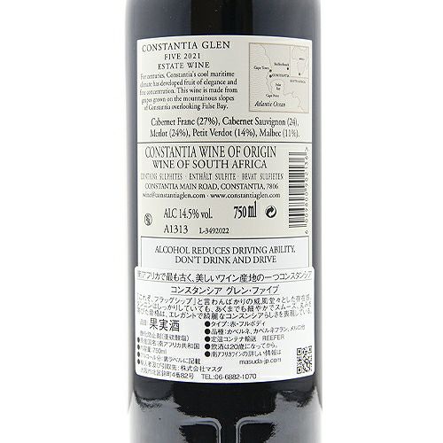 他の画像を見る 【ボルドーとナパのいいとこどり!】 コンスタンシア グレン ファイブ 2022 赤ワイン 定価 ¥ 8,250 のところ 価格 ¥ 6,996 税込 会員特別価格 ¥ 6,996 税込 カートに入れる お気に入りに登録する