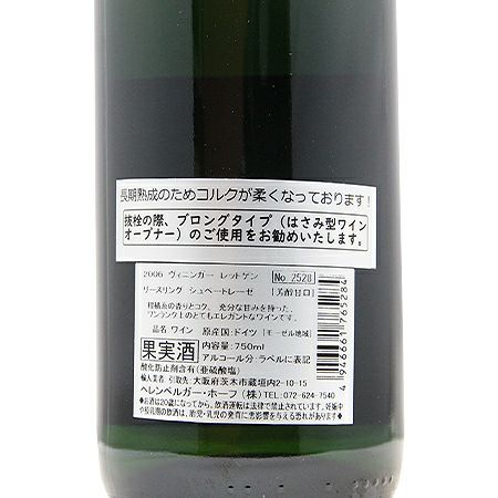 他の画像を見る 【「熟成甘口は上品」実感する1本】 ヴィニンガー レットゲン リースリング アルテ レーベン シュペトレーゼ 2006 ラインハルト ベアーテ クネーベル 白ワイン 定価 ¥ 6,600 のところ 価格 ¥ 4,950 税込 会員特別価格 ¥ 4,950 税込 在庫切れ 詳細を見る お気に入りに登録する