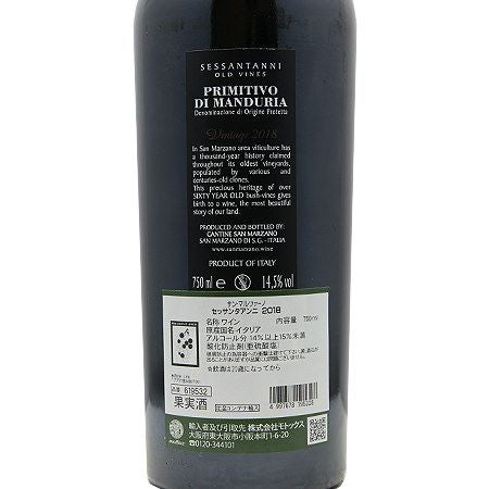 他の画像を見る 【圧倒されるような果実感「こりゃ高いワインだ!」】 セッサンタアンニ 2019 or 2020 サン マルツァーノ セッサンタアンニ 赤ワイン 定価 ¥ 5,610 のところ 価格 ¥ 4,455 税込 会員特別価格 ¥ 4,455 税込 カートに入れる お気に入りに登録する