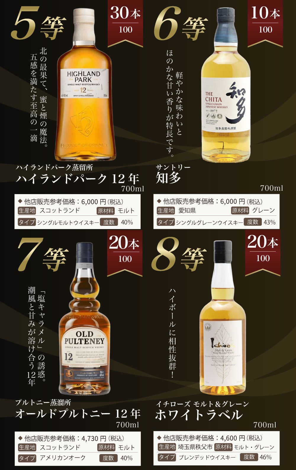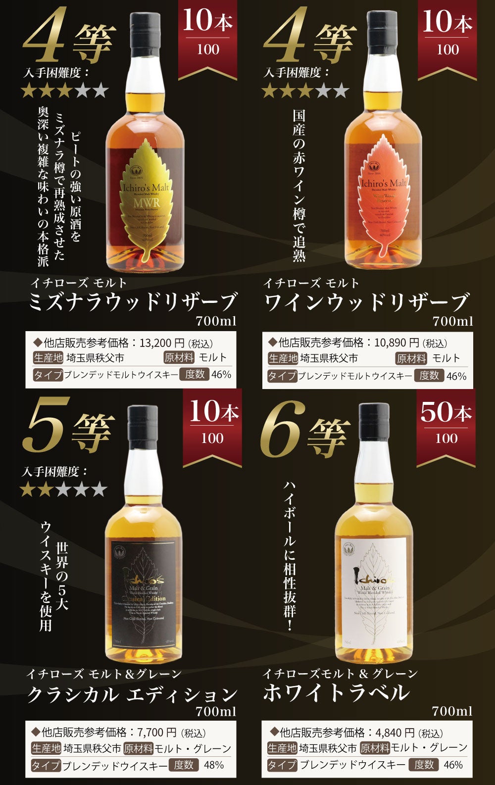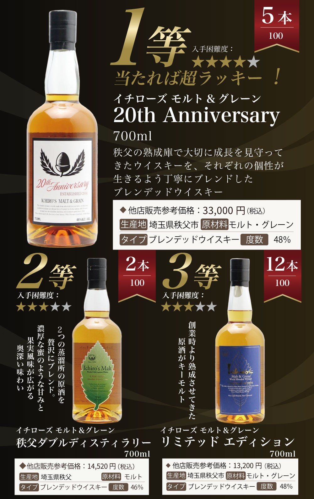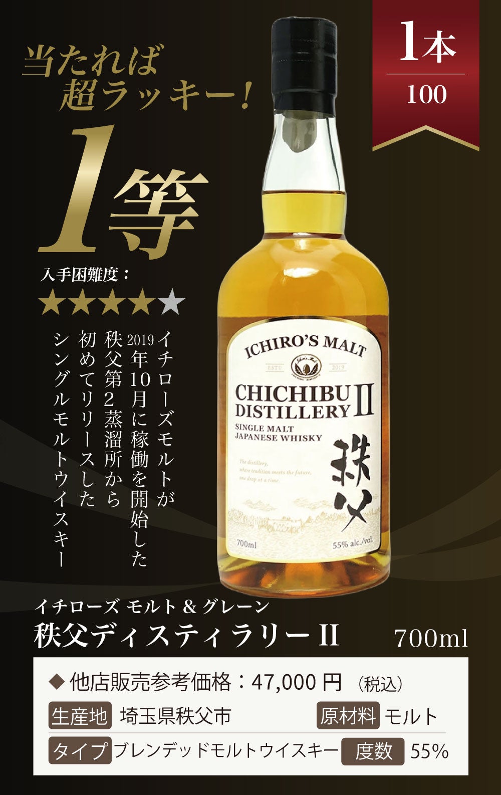 他の画像を見る 【1/4でイチローズモルトが当たるウイスキーくじ!】 【第6弾】イチローズモルトくじ!秩父 ディスティラリーII ・20thアニバーサリーが当たる!!イチローズモルトしか当たらないウイスキーくじ 定価 ¥ 7,997 のところ 価格 ¥ 7,997 税込 会員特別価格 ¥ 7,997 税込 詳細を見る お気に入りに登録する