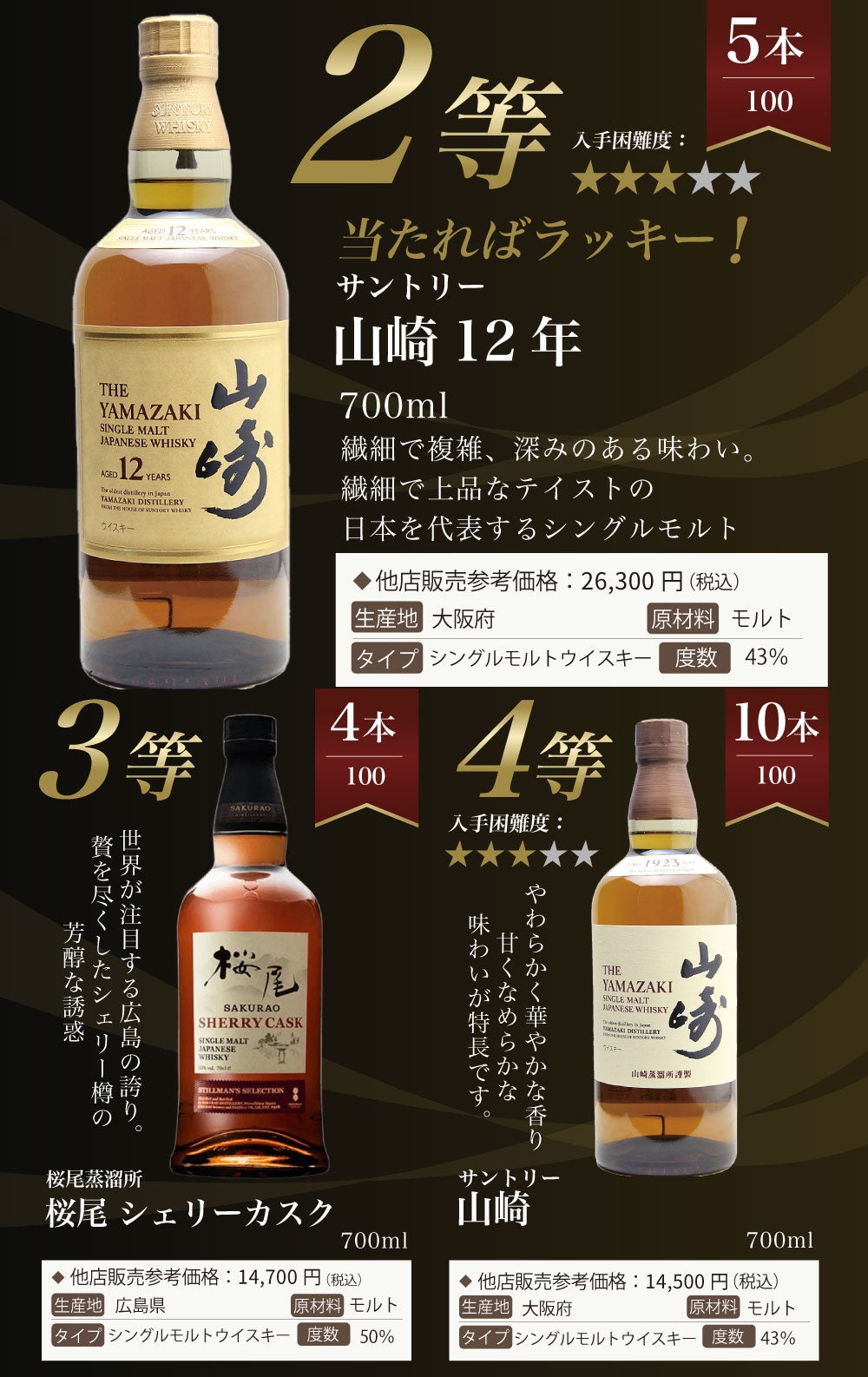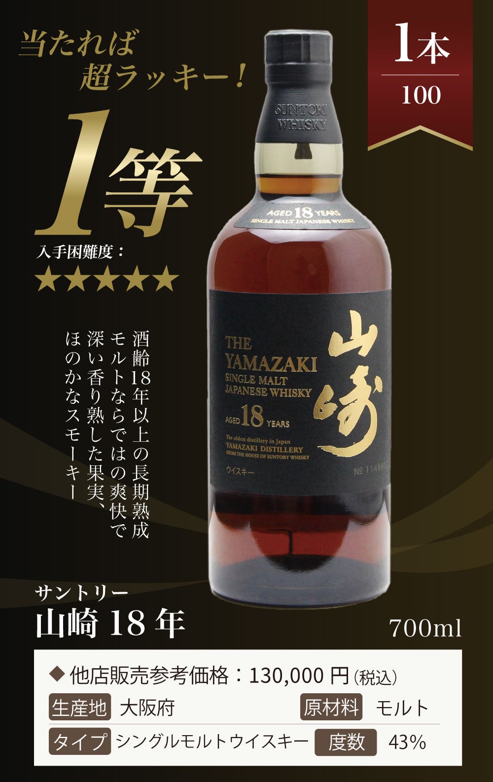 他の画像を見る 【山崎18年が当たる!ウイスキーくじ】 【第24弾】山崎18年くじ!高確率で日本ウイスキー当たる!1/100で山崎18年・1/20で山崎12年・1/10で山崎ノンヴィンテージ!!100本で高確率ガチャ・ウイスキーくじ 定価 ¥ 7,755 のところ 価格 ¥ 7,755 税込 会員特別価格 ¥ 7,755 税込 詳細を見る お気に入りに登録する