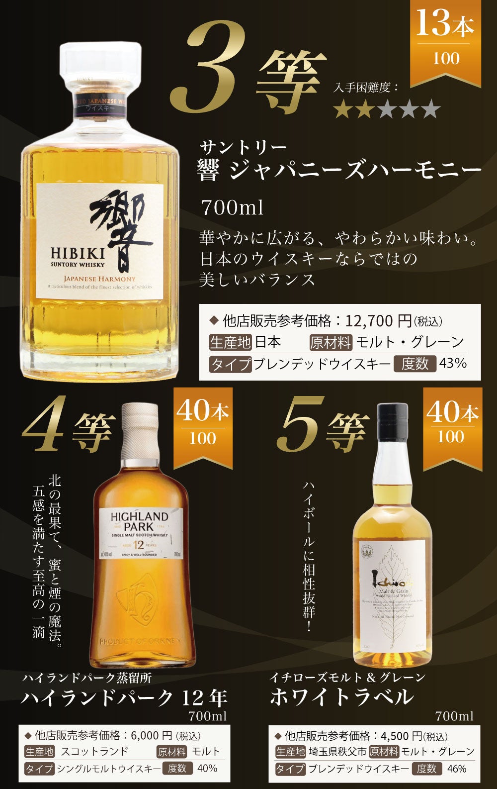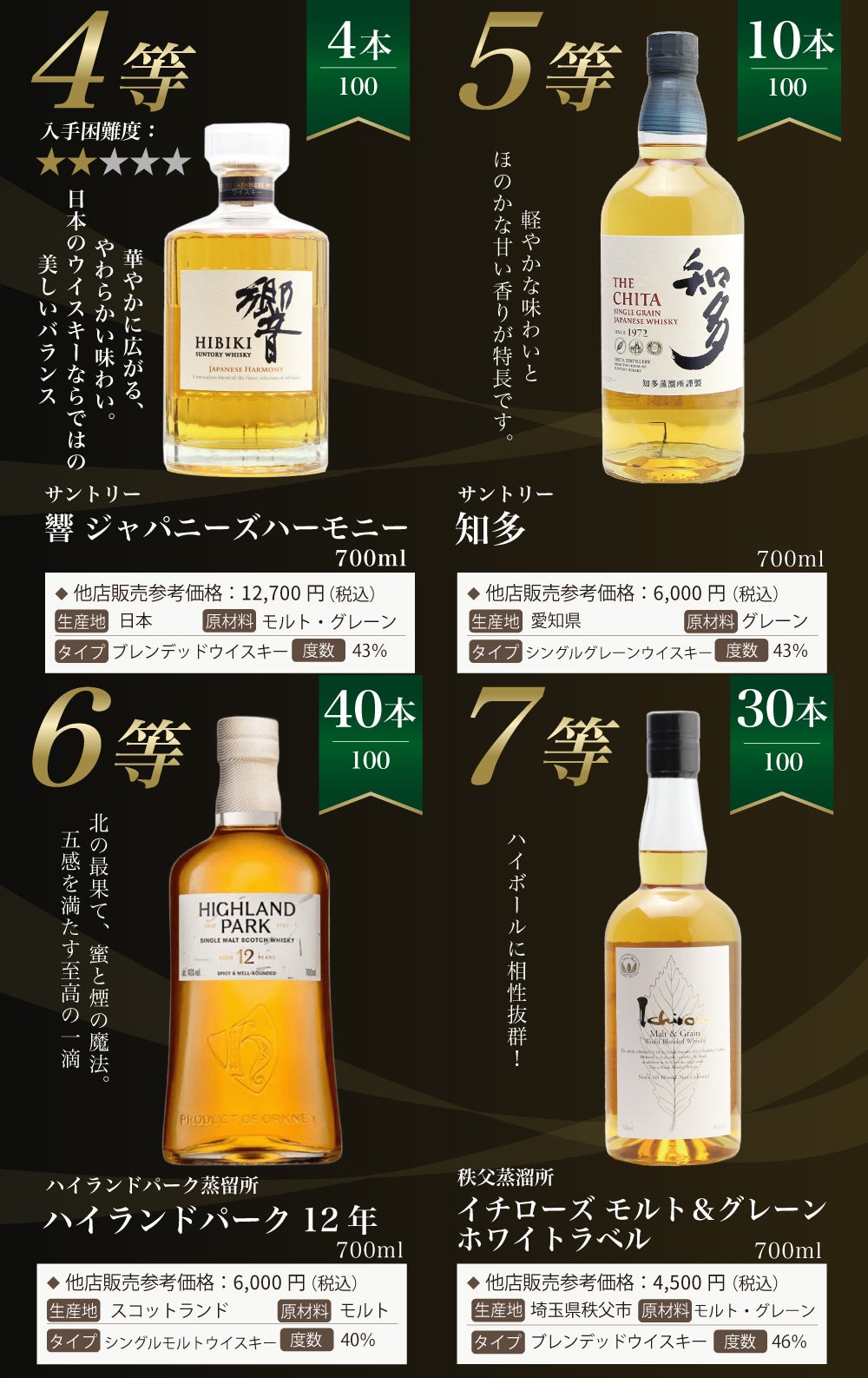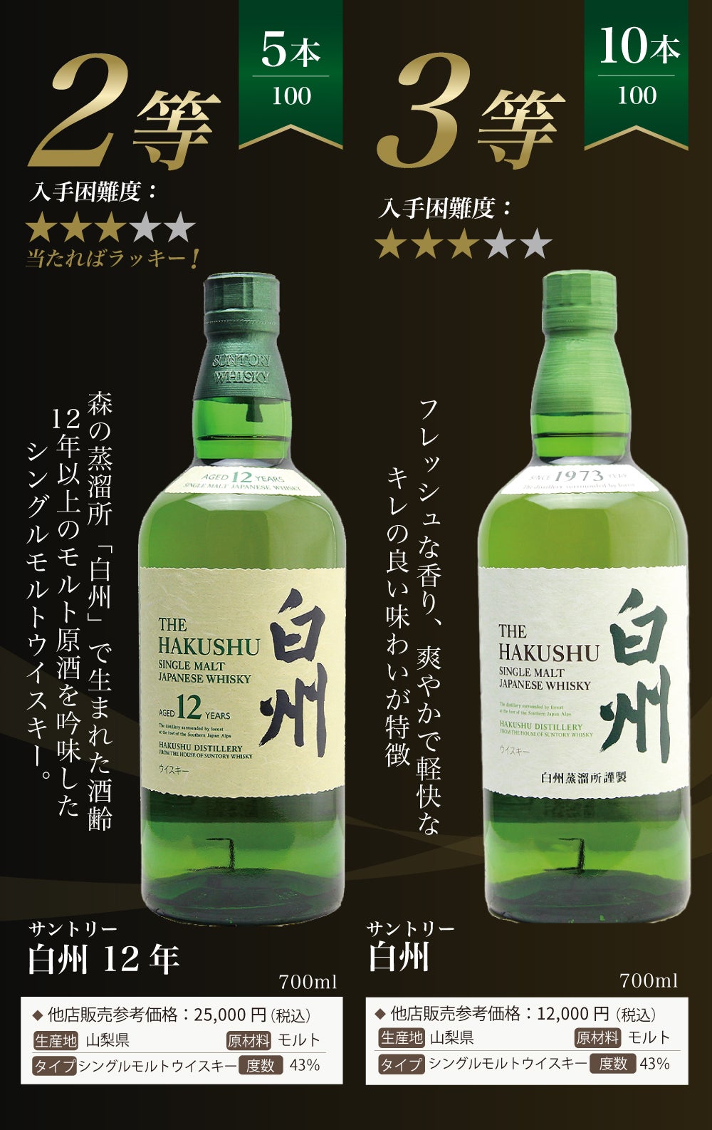 他の画像を見る 【白州18年・白州12年・白州が当たる!ウイスキーくじ】 【第28弾】白州18年くじ!高確率・ウイスキーガチャ・1/100で白州18年・1/20で白州12年・1/10で白州が当たる!100本で高確率!!60%でジャパニーズウイスキーが当たる!! 定価 ¥ 7,810 のところ 価格 ¥ 7,810 税込 会員特別価格 ¥ 7,810 税込 詳細を見る お気に入りに登録する