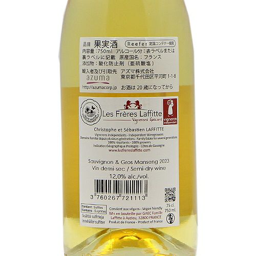 他の画像を見る 【ほんのちょっぴりの甘さが抜群にイイ!】 ソーヴィニヨン アンド グロ マンサン 2024 ドメーヌ デ フレール ラフィット 白ワイン 定価 ¥ 2,200 のところ 価格 ¥ 1,892 税込 会員特別価格 ¥ 1,892 税込 カートに入れる お気に入りに登録する