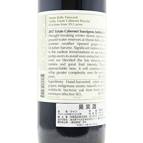 他の画像を見る 【モンテベロの弟分】 リッジ ヴィンヤーズ エステート カベルネ ソーヴィニヨン 2017 赤ワイン 定価 ¥ 14,850 のところ 価格 ¥ 13,860 税込 会員特別価格 ¥ 13,860 税込 カートに入れる お気に入りに登録する